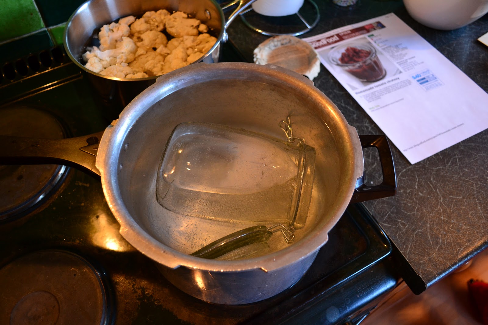 Firstly, we had to sterilise the jar which, according to the instructions, needed to be immersed in water and have at least 3cm above it. This proved difficult as our largest pan had cauliflower in it (see above photo!) and we therefore had to use a pressure cooker. This was a laborious task but it allowed me to do all the prep needed.